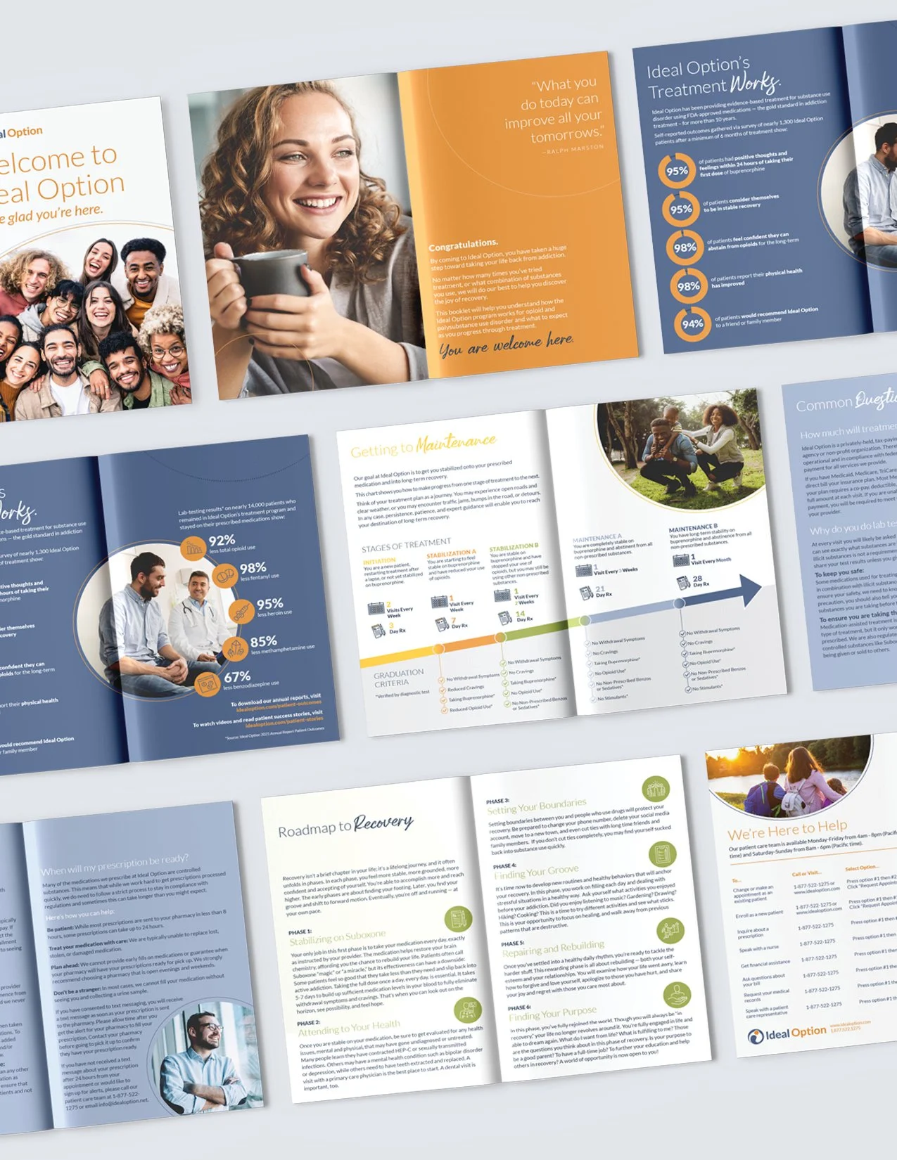Whenever new patients arrive at an Ideal Option clinic, they receive this brochure welcoming them and outlining treatment stages, common questions, and treatment outcomes.